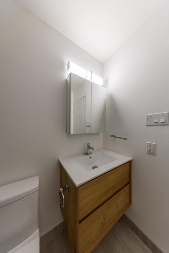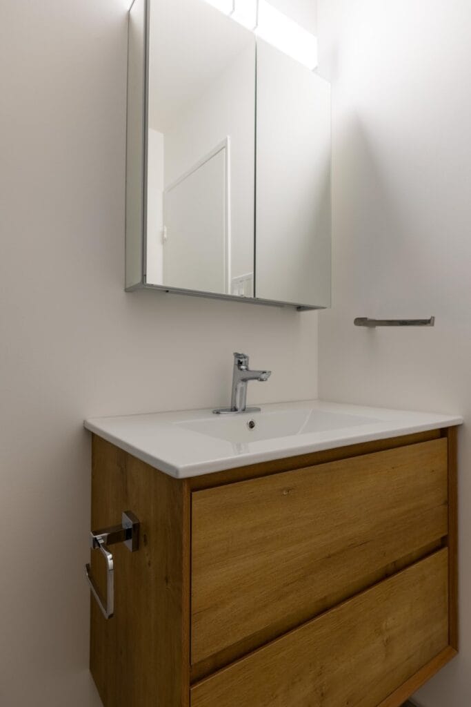Waterproofing is never visible, but it is the foundation of everything we do. Installing tile is not waterproofing — it’s a finish. In this condo, wall depth limitations meant the shower niche could only be placed on the valve wall, carefully positioned between the shower head and controls. A portable teak shower stool was chosen instead of a fixed bench, giving flexibility without sacrificing safety.