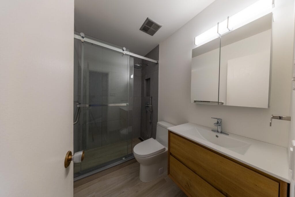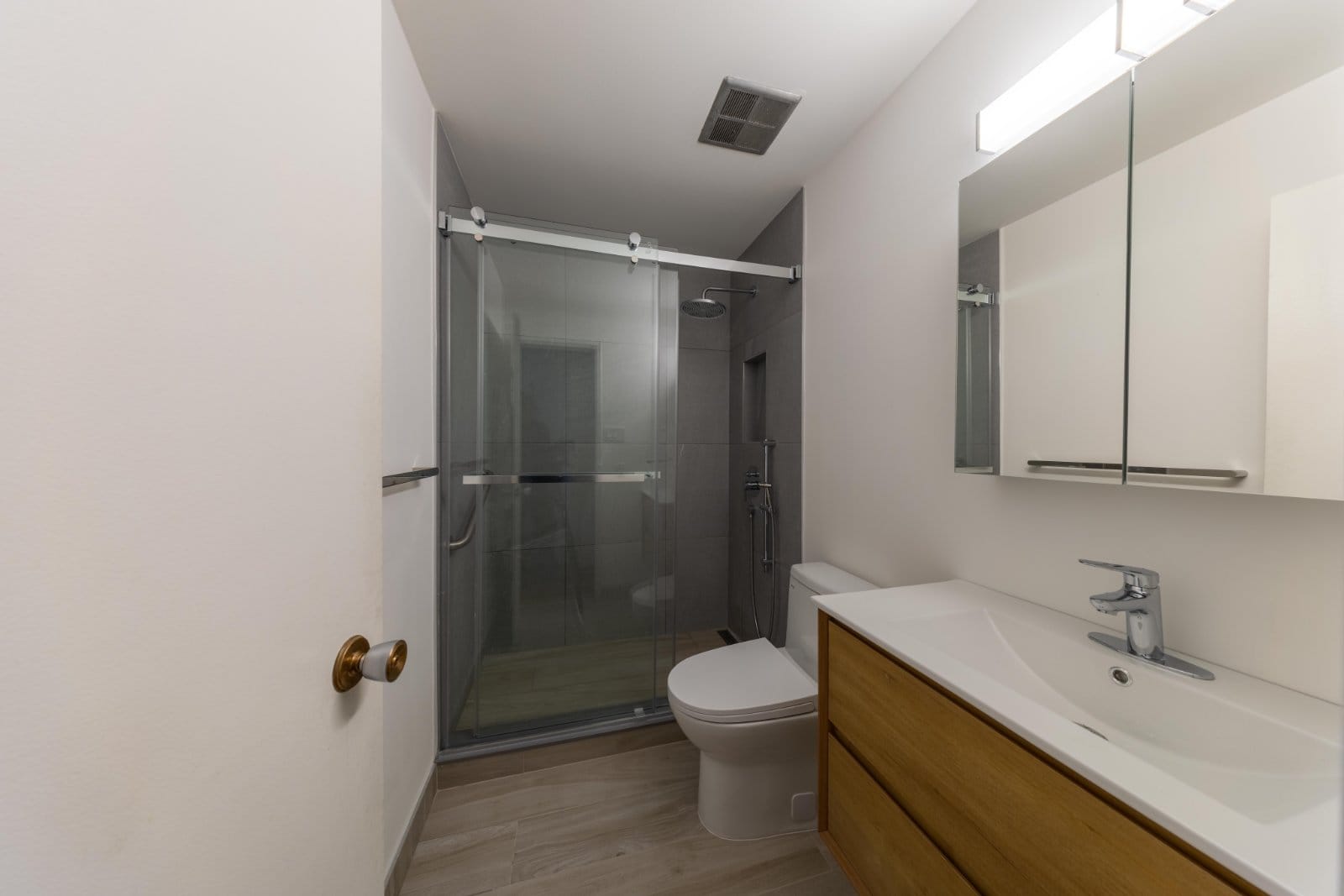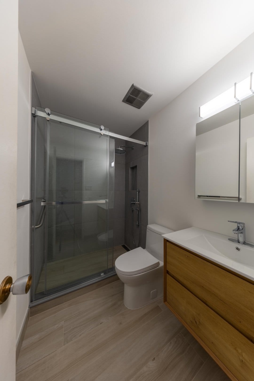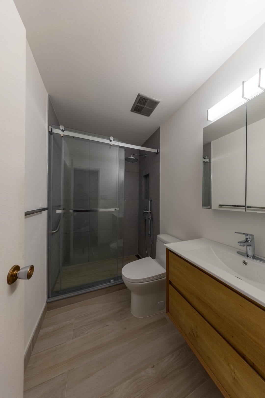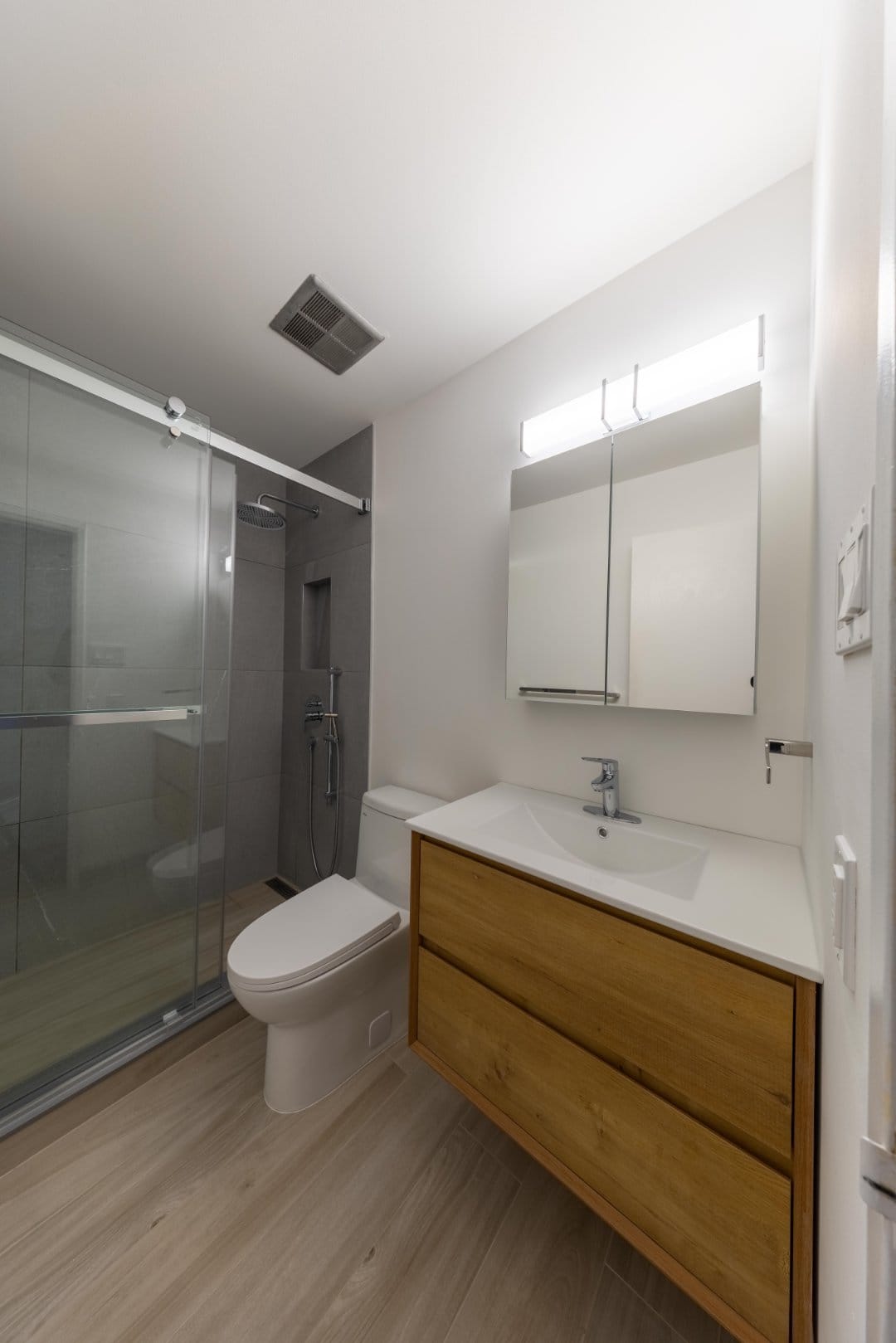 We completed a full tub-to-shower conversion, fully waterproofed using Schluter systems. The shower features slip-resistant floor tiles, a low entry threshold, an integrated grab bar, and double bypass sliding glass doors for easy access. Large-format, neutral tiles create a calm, timeless look, while the compact vanity and wall-mounted medicine cabinet maximize storage without crowding the space.