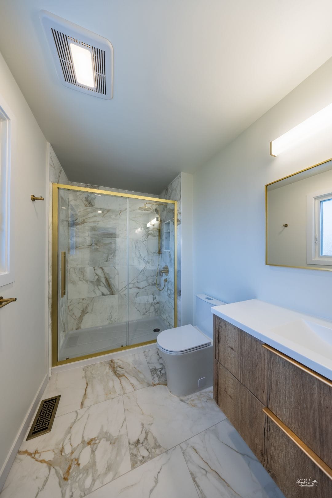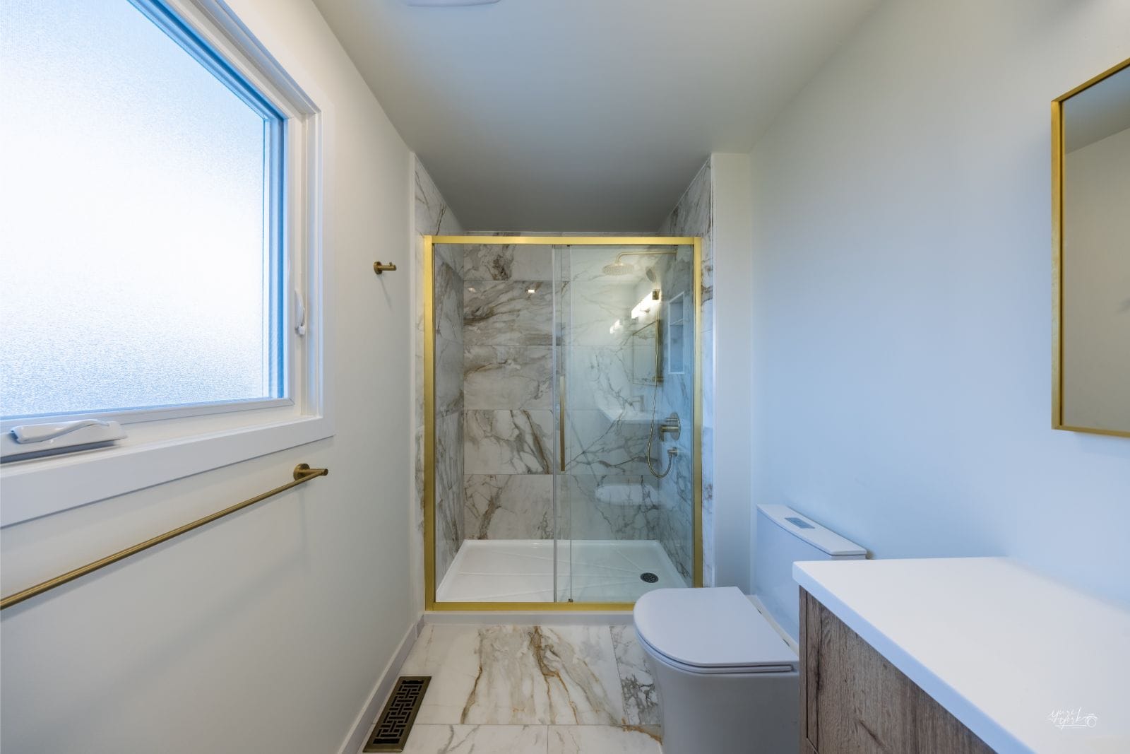 We’re excited to share one of our latest projects — a 3-piece bathroom renovation in Ottawa that took a space from clean but dated to warm, grounded, and clearly elevated. This bathroom wasn’t broken, but it had grown tired. The original layout was tight, and while everything matched — white tile, chrome finishes, a standard vanity and sliding shower doors — it felt like it was holding its breath. The space needed more than a touch-up. It needed a rethink. Now, that same bathroom feels brighter, more open, and visually calm. Nothing was expanded, but the space feels larger — thanks to smart material choices, thoughtful layout updates, and the quiet glow of gold accents where they matter.