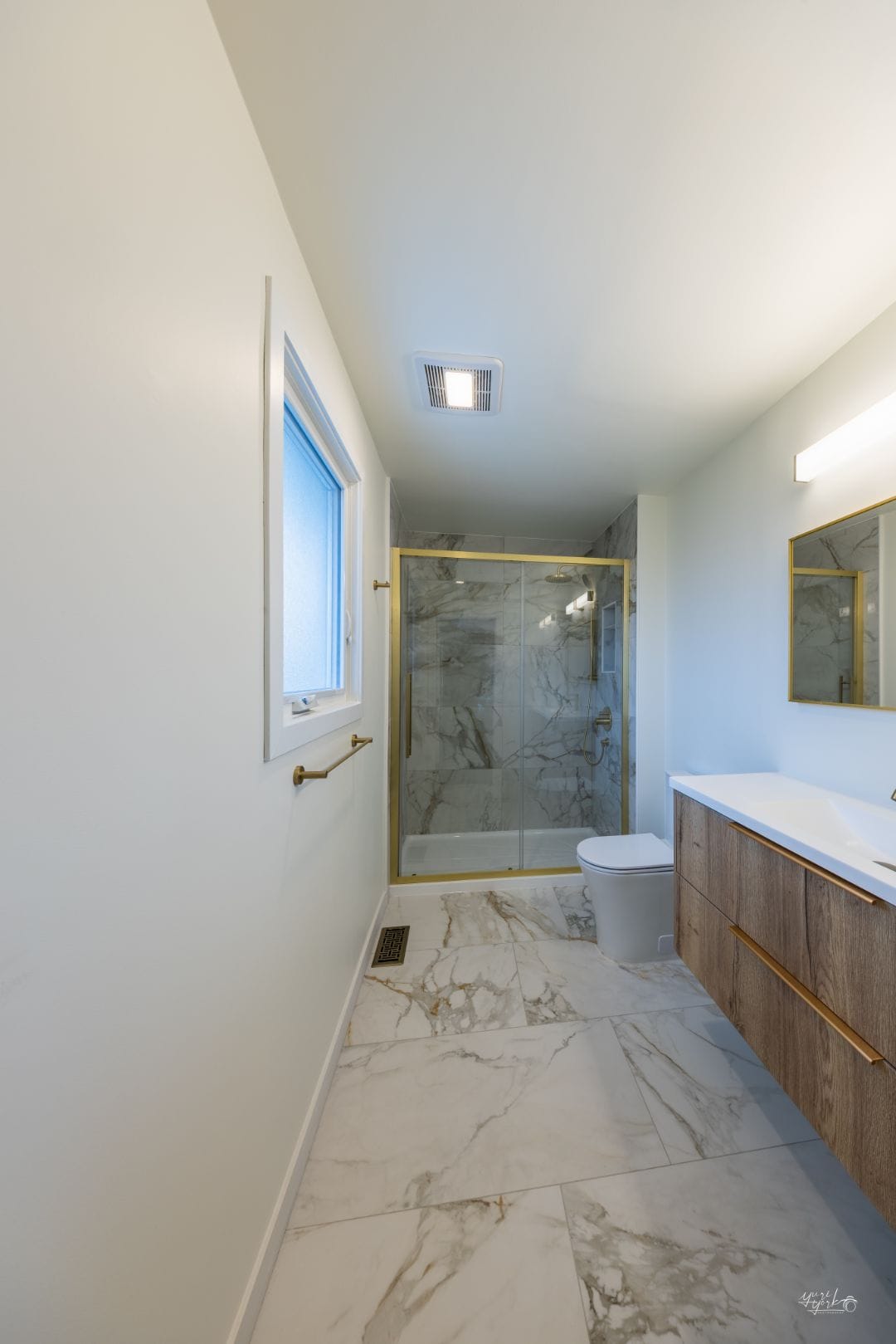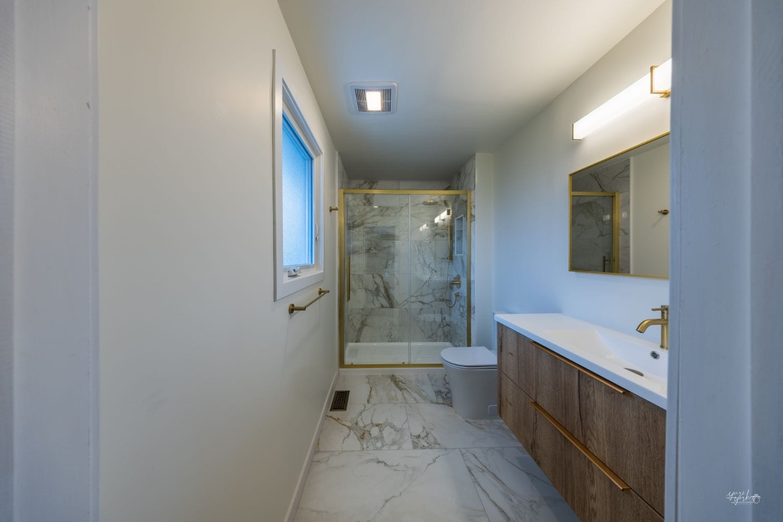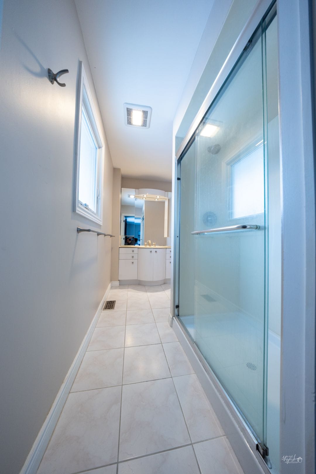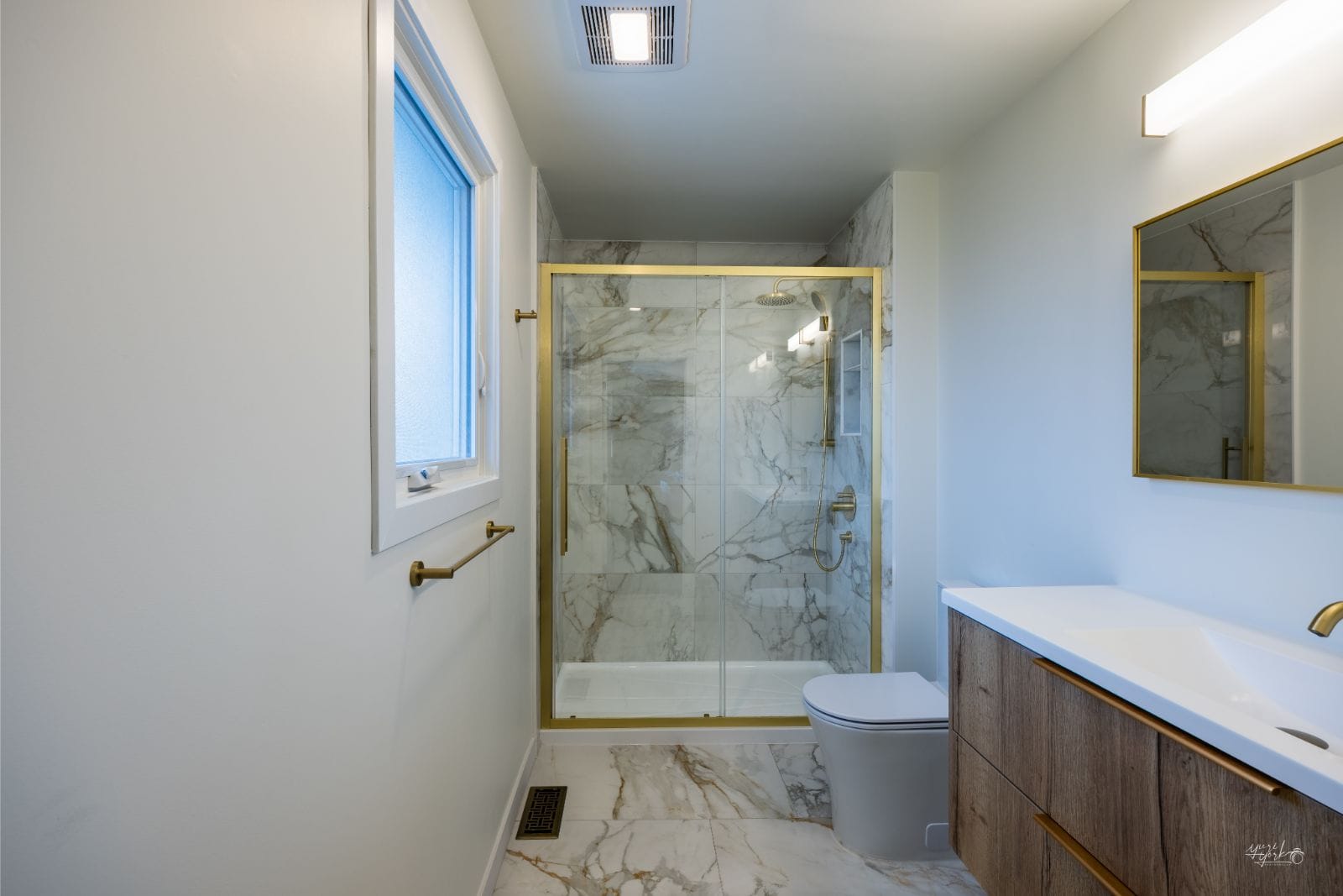 The real standout is the custom framed glass shower enclosure with gold trim. Where the old shower closed the space off, this one invites light to move through. The framing adds structure without adding weight, and ties in perfectly with the gold hardware across the vanity and towel bars.
